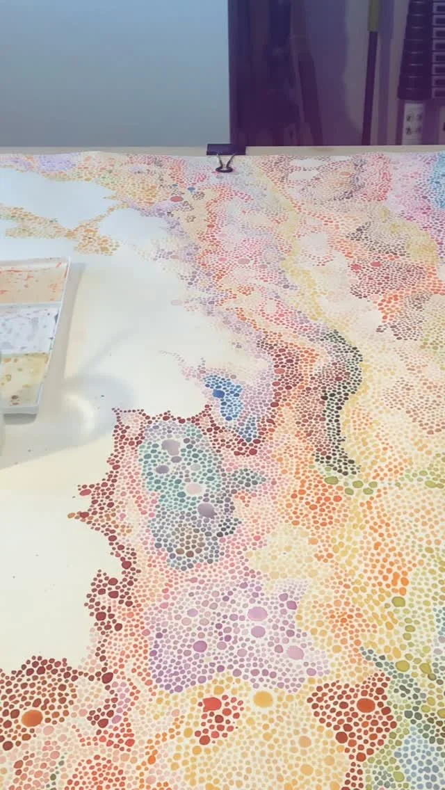 Kristine’s work meets at the intersection of the tragically obscured and the plainly evident. Her practice of making dots explores humanity's significance in the universe at large, both collectively and individually. Her work is meant to be experienced at multiple viewing distances—this viewer immersion of zooming in and out gives each piece the vibration of living matter, allowing minute detail to transform into a collective whole. For Kristine, her practice invites the seeing of dichotomy—that two opposing things can simultaneously be true—that both everything and nothing can matter at the same time. She celebrates what others may deem as imperfection in an effort to show that there is no larger picture without the sum of its parts. Kristine harnesses her intimate knowledge of both light and darkness to show that while we are a product of our experiences, it is how we shape, interpret and integrate them into our lives that forms us as a cohesive whole.
